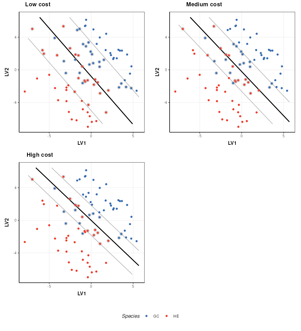 Note that best practice would be to select the optimal kernel parameter(s) in combination with the cost parameter (e.g. by 2d grid search) so that the best combination of both is identified.