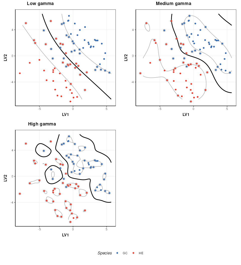 The parameters of a kernel can be used to control the complexity of the boundary. Here I show how the radial kernel parameter “gamma” can be used to change the complexity of the boundary. In combination with the cost parameter (which I keep constant here) this allows for highly flexible boundary models.