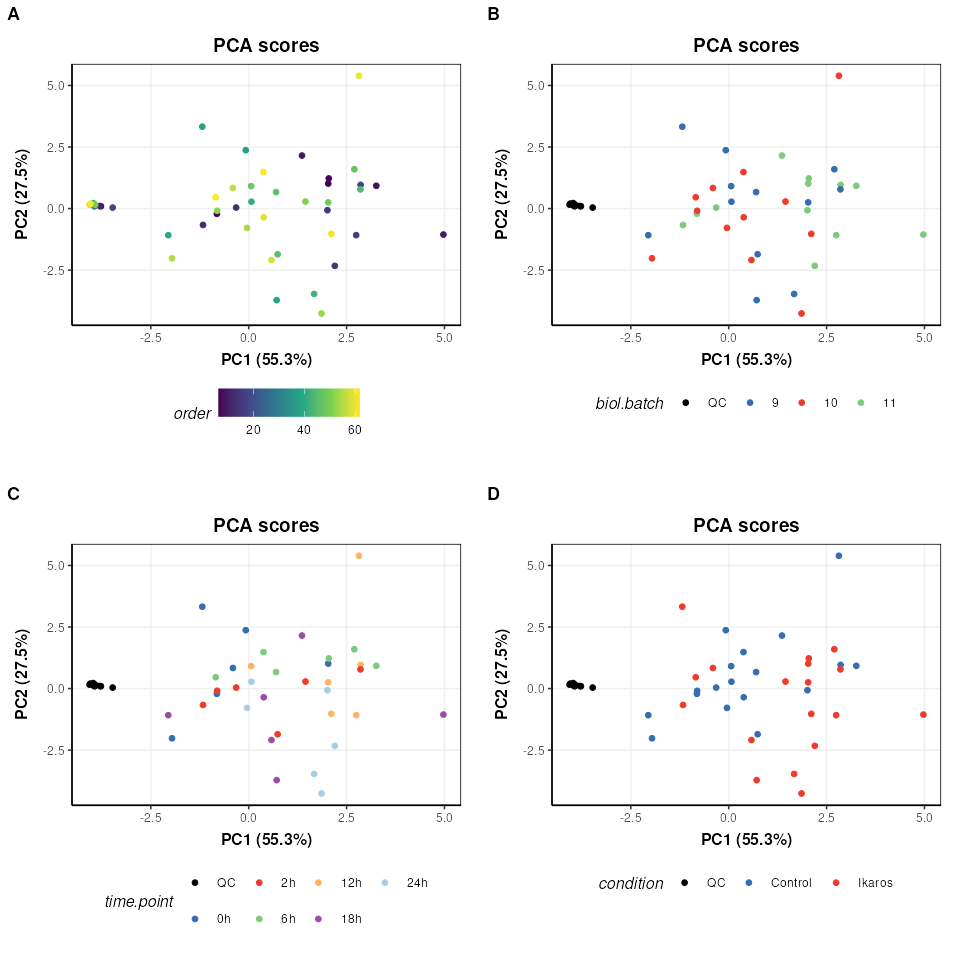 Now we will plot the QC samples in context with the samples. There are several possible approaches, and we will apply the approach of applying PCA to the full dataset including the QCs. We will exclude the blanks as it is likely that they will dominate the plot if not removed. All samples from batch 12 were excluded from STATegra and we will replicate that here.